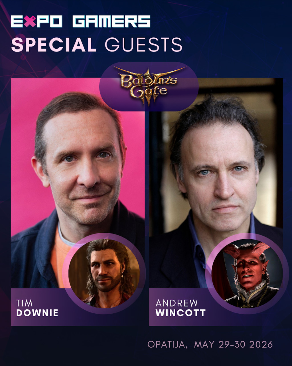 Posebno se ističe dolazak gostiju iz megapopularne i višestruko nagrađivane igre Baldur’s Gate 3. U Opatiju stižu glasovi koje su igrači diljem svijeta zavoljeli: Tim Downie (Gale) i Andrew Wincott (Raphael), kao i Borislav Slavov, nagrađivani skladatelj zaslužan za nezaboravnu glazbu ovog globalnog hita. Posjetitelji će imati priliku prisustvovati njihovim panelima i predavanjima, ali i upoznati ih uživo kroz posebnu “Meet & Greet” zonu uz autograme i fotografije.